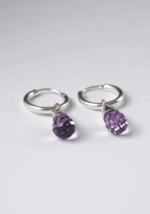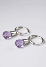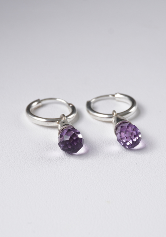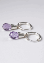 Aros argolla elaborados en plata 925 con piedra Amatista facetada en forma de gota alargada.