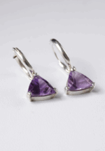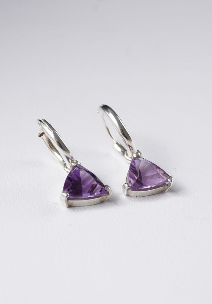 Aros argolla elaborados en plata 925 con piedra Amatista facetada en forma de triangulo.