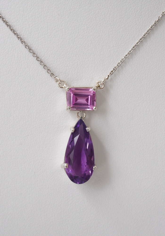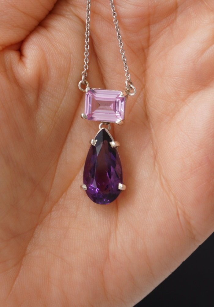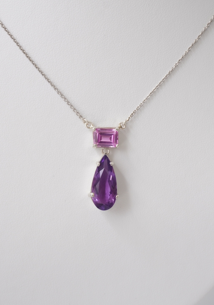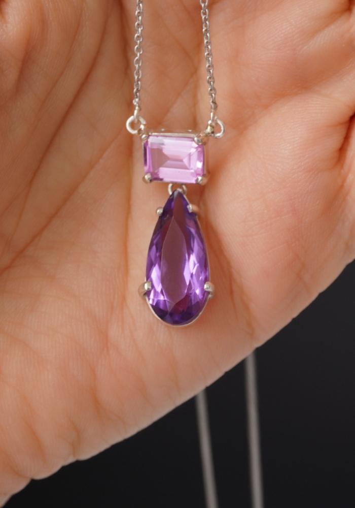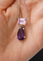 Colgante de plata 925 en combinación con dos piedras, amatista con forma de gota y rosa de Francia.